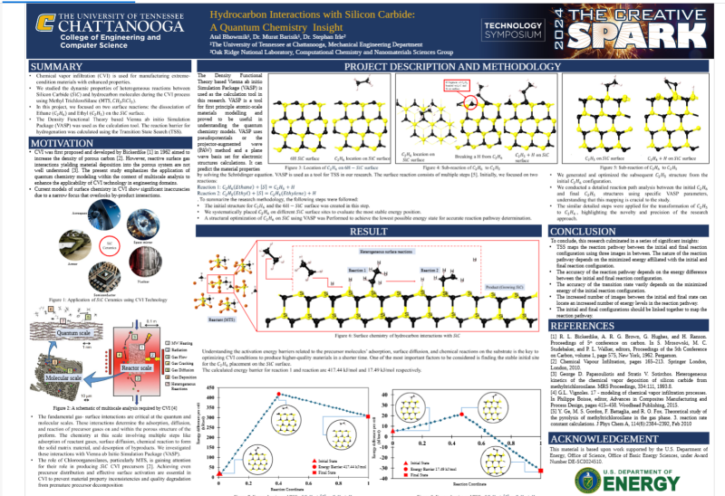 Chemical vapor infiltration (CVI) is used for manufacturing extreme-condition materials with enhanced properties. However, reactive surface gas interactions yielding material deposition into the porous system are not well-understood. As a part of our ongoing Department of Energy (DOE) project, we studied the dynamic properties of heterogeneous reactions between silicon carbide (SiC) and various hydrocarbon molecules during the CVI process. The precursors generated by the thermal breakdown of methyl trichlorosilane (MTS, CH3SiCl3) were studied in this work. The surface reaction consists of multiple steps. In the beginning, we focused on two reactions: the dissociation of Ethane and ethylene on the SiC surface. The Density Functional Theory-based Vienna ab initio Simulation Package (VASP) was used as the calculation tool. The reaction barrier for hydrogenation was calculated using the Transition State Search. Understanding the activation energy barriers related to the precursor molecules' adsorption, surface diffusion, and chemical reactions on the substrate is the key to optimizing CVI conditions to produce higher-quality materials in a shorter time.